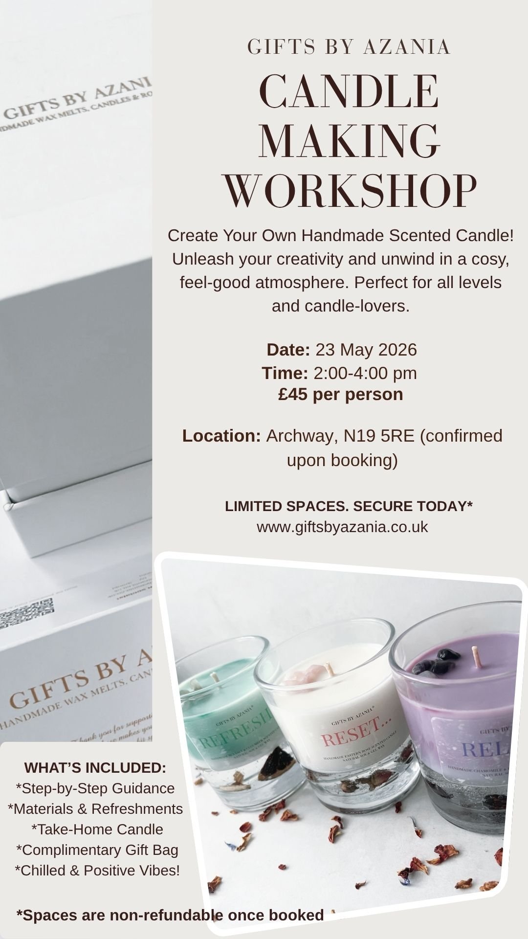 You’ll be guided through the entire process step-by-step by our CEO & Founder Azania as you create your own bespoke scented candle to take home and enjoy.