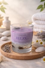 Transport yourself to a peaceful retreat with the soothing scent of dominant notes of lavender and chamomile, mixed with other notes of cooling eucalyptus and peppermint, descending onto floral geranium in our Relax wellness scented candle.